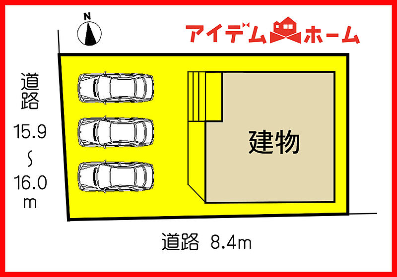 | 駐車場 | 3台(駐車3台可能なカースペース) | 道路の幅員 | 西側 15.9m 角地 公道、南側 8.4m 角地 公道 |