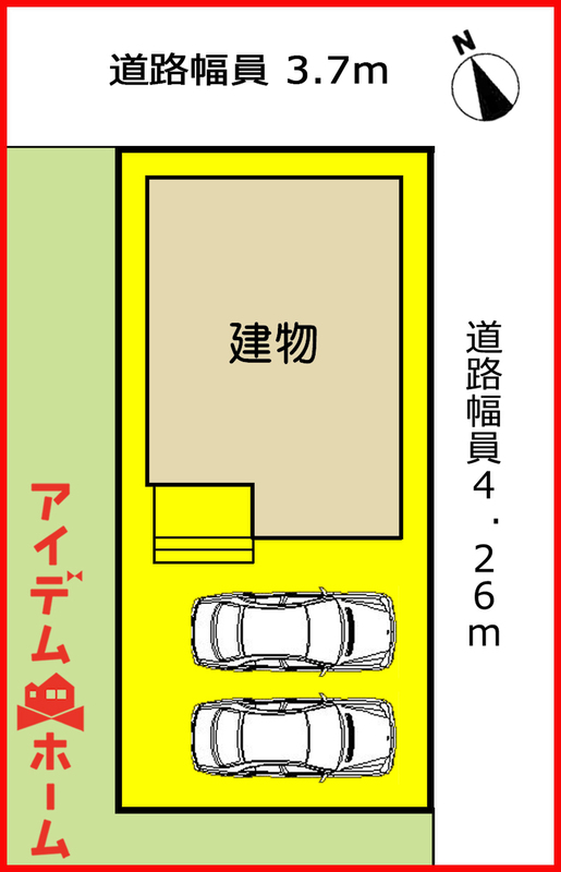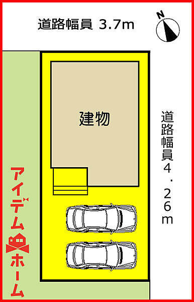 | 駐車場 | 2台(駐車2台可能なカースペース) | 道路の幅員 | 北東側 3.7m 、南東側 4.2m 公道 |