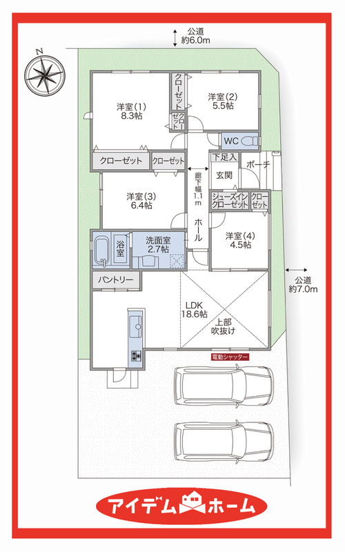 | 駐車場 | 2台(2台) | 道路の幅員 | 北側幅員6.0m公道、東側幅員7.0m |