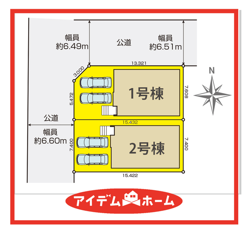 | 駐車場 | 2台 | 道路の幅員 | 北側幅員約6.5m、西側幅員約6.6m |