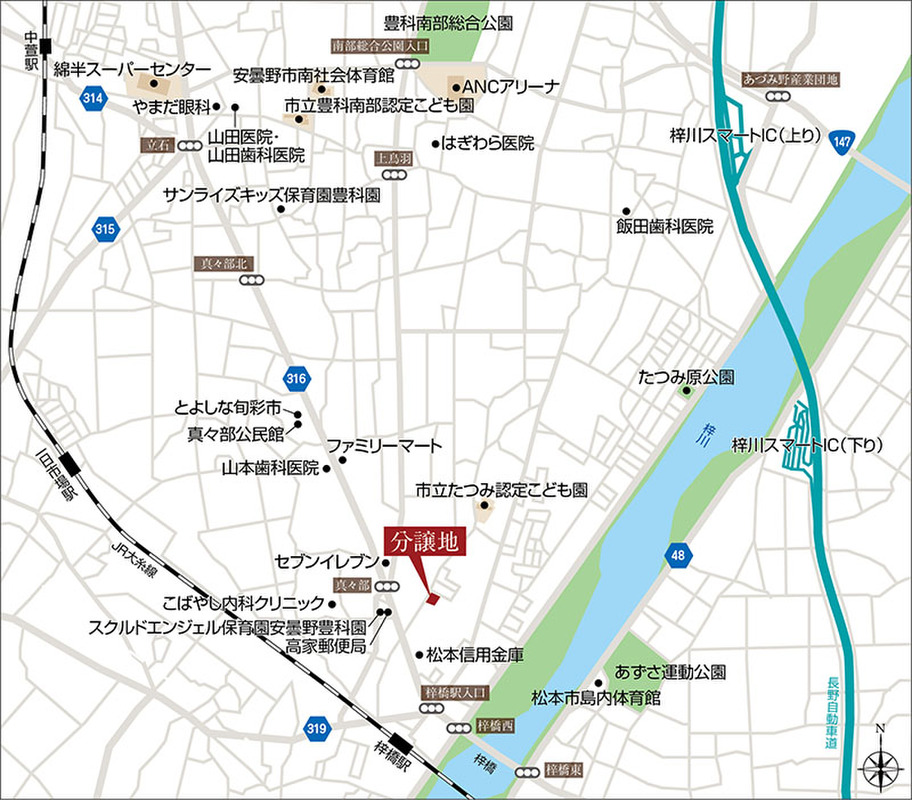 梓川のすぐ北に位置し、川を渡れば松本市。松本市への近さも魅力。