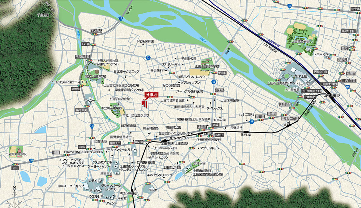 上田電鉄別所線「上田原」駅 徒歩9分~11分 分譲地入口から約700~830m |