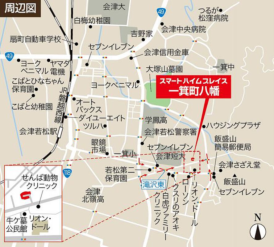 JR磐越西線「会津若松」駅 会津バス乗車13分、滝沢バス停 徒歩3分~4分 会津鉄道「会津若松」駅 徒歩23分 |
