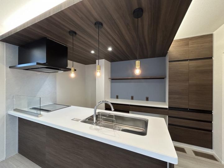 背面のカップボードはカフェライクな見せる収納。間接照明とペンダ...