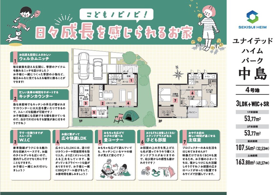| 建物面積 | 107.54m2(4号地)~115.87m2(1号地) | 土地面積 | 163.88m2(1区画)~201.33m2(1区画) |