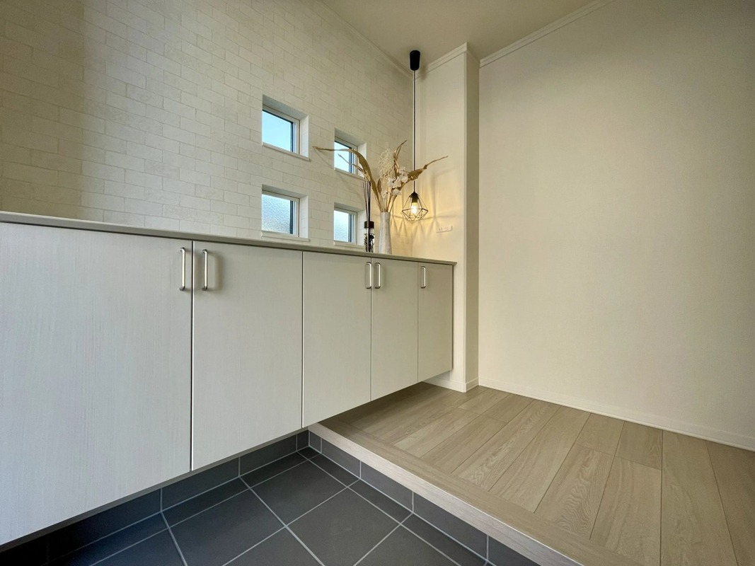 豊富なホール収納やファミクロで片付けを時短。共働き世帯に嬉しい家事動線と、太陽光・蓄電池による災害への強さを両立しました。