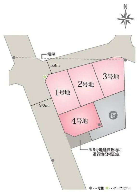 | 駐車場 | 2台 ~ 3台(1・2号地(2台)、3・4号地(3台)) | 道路の幅員 | 北側5.8m、西側9.0m※倉敷市道(5号地は延長敷地あり) |