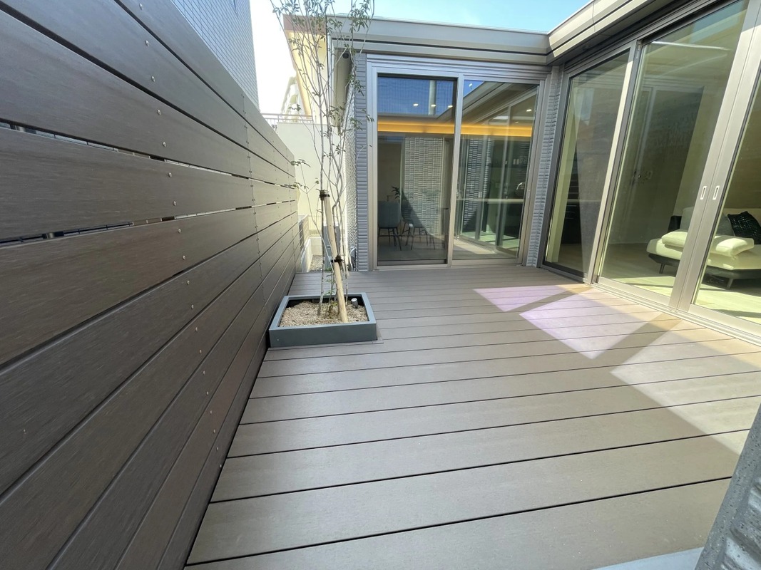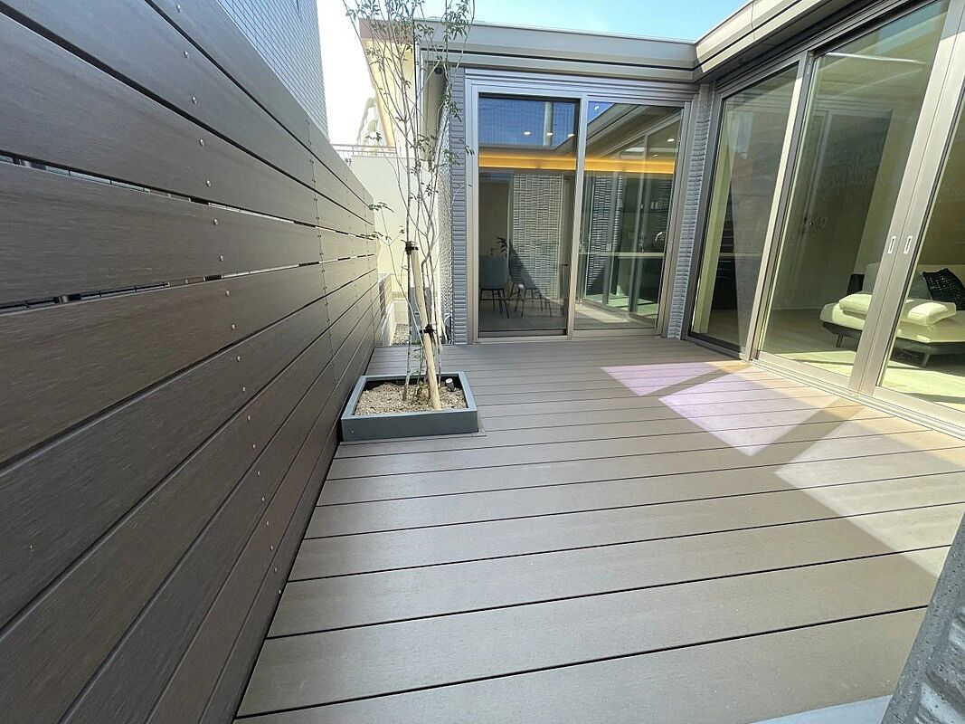 ■開放感あふれる中庭ウッドデッキを採用。外とつながる心地よい住空間を演出。