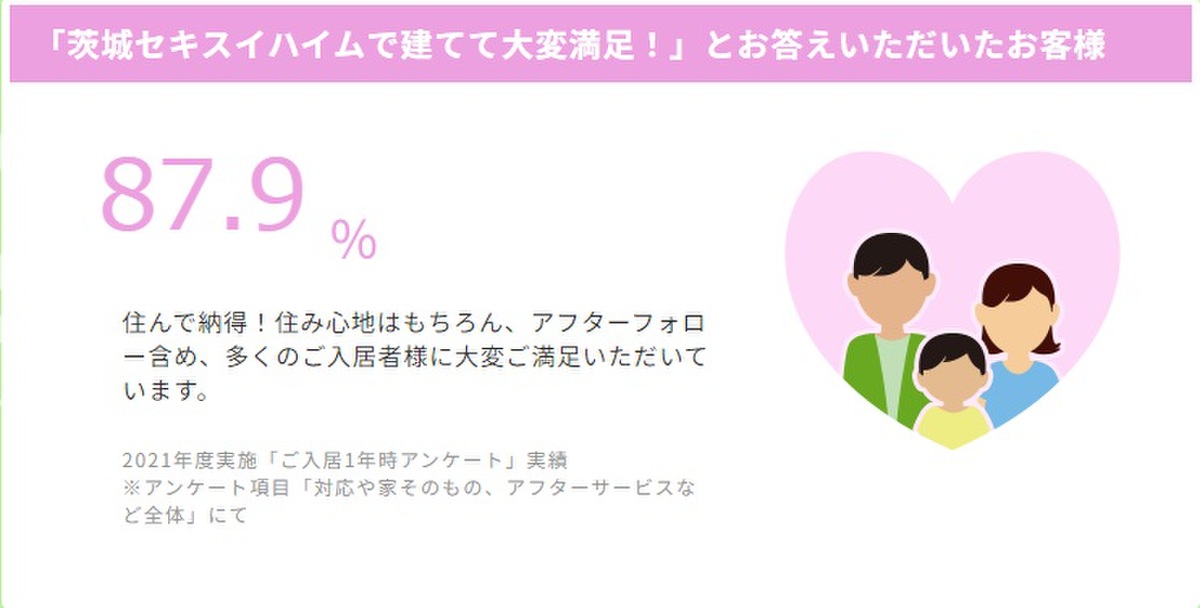 ◎「茨城セキスイハイムで建てて大変満足!」とお答えいただいたお客様は 87.9%!(2021年度実施「ご入居1年時アンケート」実績)住んで納得。住み心地はもちろん、アフターフォロー含め、多くのご入居者様に大変ご満足いただいています。
