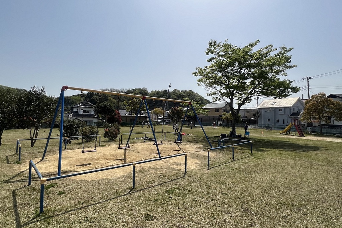 ブランコ、鉄棒、滑り台、シーソーがある広々とした公園。トイレも...