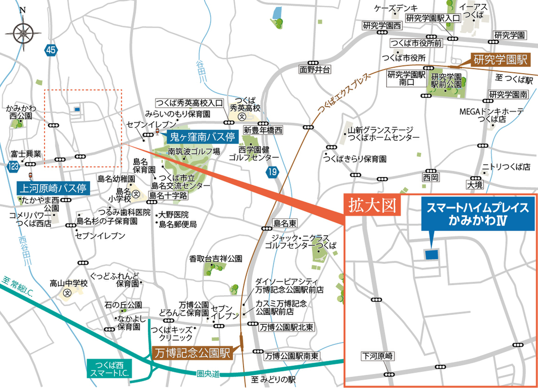 徒歩18分~19分の「鬼ケ窪南」バス停よりバス13分でつくばエクスプレス「万博記念公園」駅 |