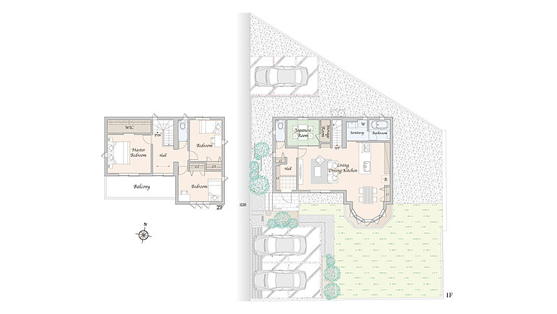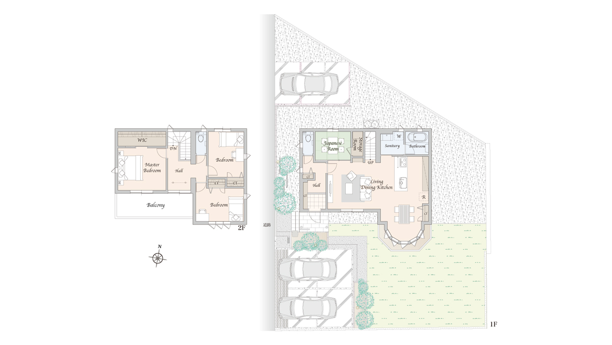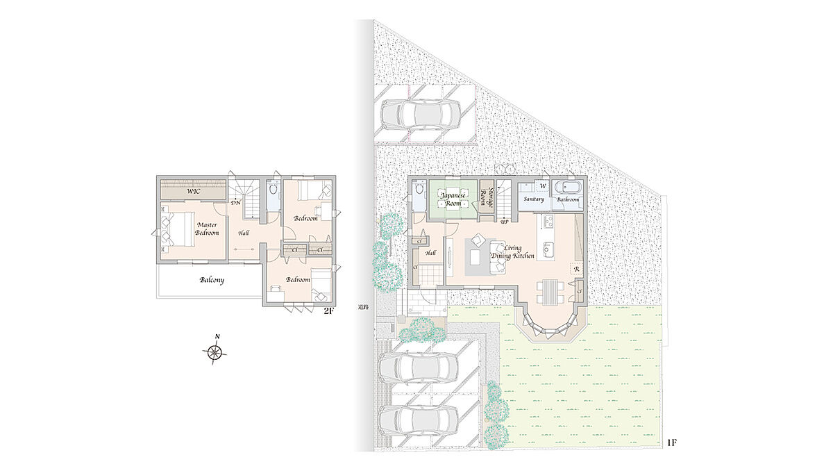 LDKに設けたボウウインドウが、室内にやわらかな光と奥行きをもたらします。また、水回りを集約した動線計画により、日々の家事を効率よくサポート。