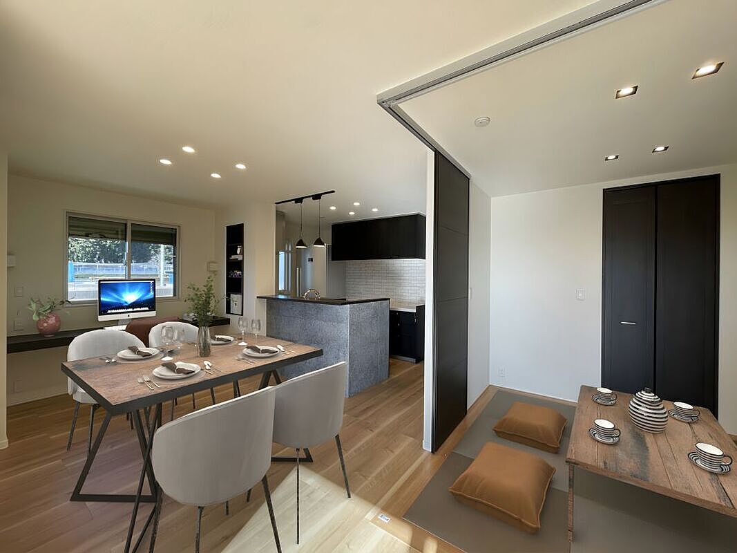 リビングとダイニングが緩やかに分かれ、食事空間とくつろぎ空間にメリハリを持たせることができます。リビング併設の和室は来客時や家事コーナーに活躍