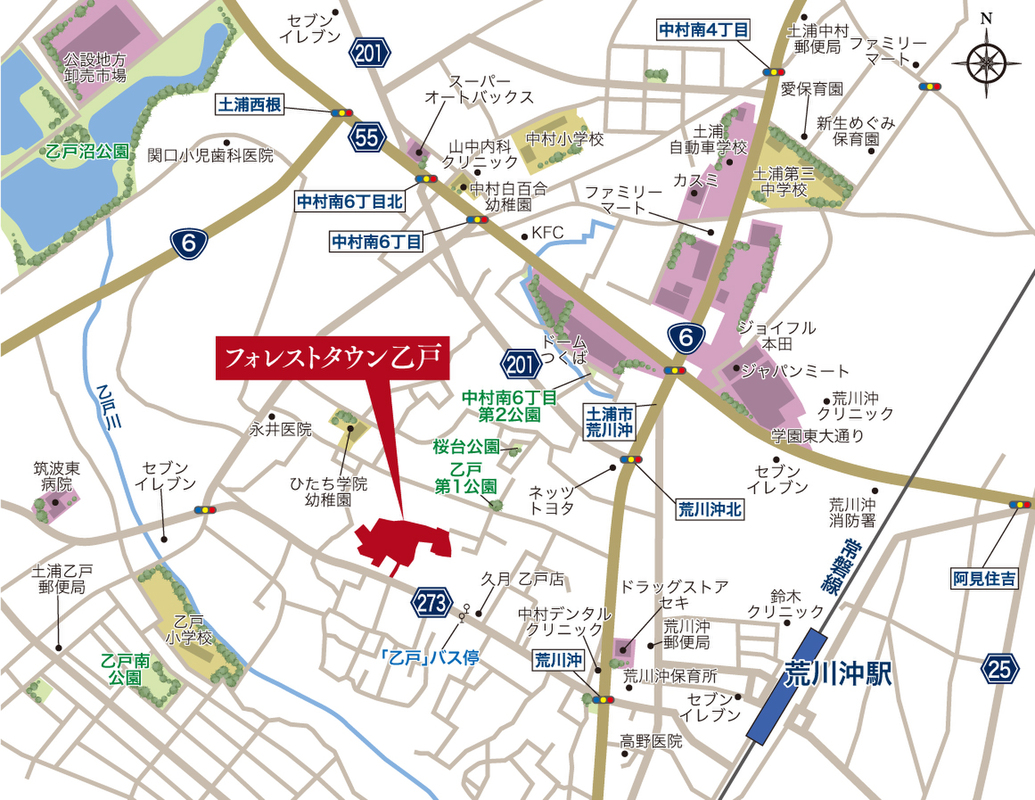 JR常磐線「荒川沖」駅 「乙戸」バス停からバス7分 徒歩5分~6分 徒歩17分~18分(約1320m~1420m) |