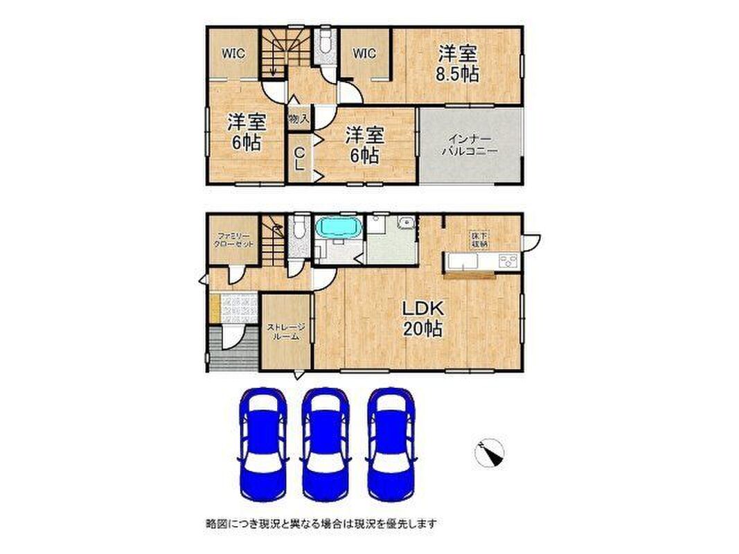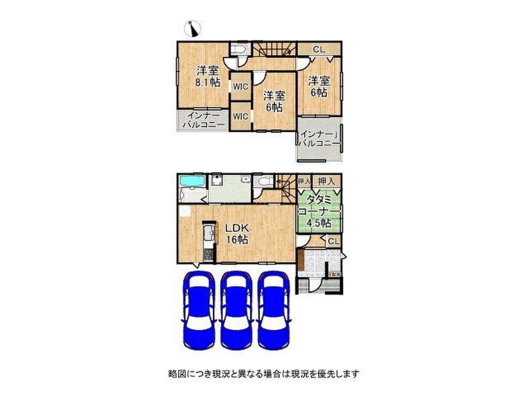 | 間取り | 3LDK・3LDK+S南向き・和室・インナーバルコニー・ワイドバルコニー・2面以上バルコニー・WIC・全居室収納・駐車3台・LDK16帖以上 | 建物構造 | 木造2階建て |