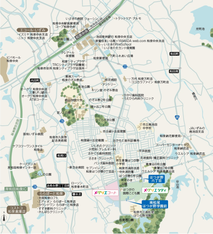 小中一貫校「市立南松尾はつが野学園」(徒歩6分/約456~480m)が隣接する教育環境に加え、最寄駅「和泉中央」駅周辺には多彩な商業施設が揃った利便性に優れた好環境。また、周辺には