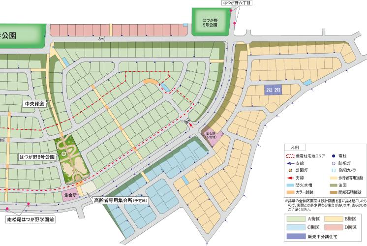 | 備考 | ●道路/公道●その他法令上の制限/地区計画、宅地造成及び特定盛土等規制法区域、埋蔵文化財包蔵地、他●街づくりガイドライン/良好なまちなみの形成を図るため「街づくりガイドライン」を作成しています。●諸費用/集会所建設分担金50000円(B街区のみ)、CATV引込可(購入者負担)●総戸数:404戸(内、積水ハウス100戸) | ||