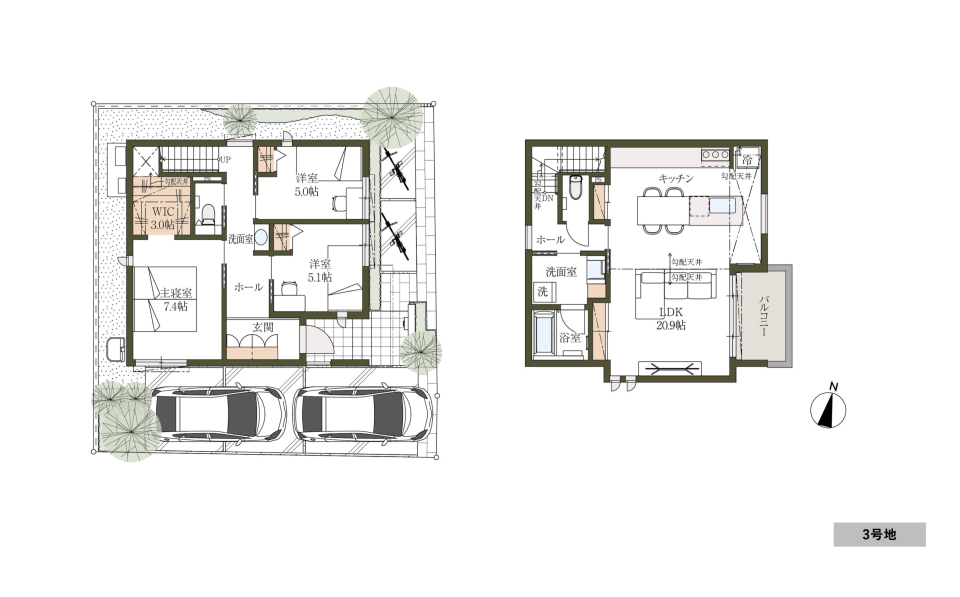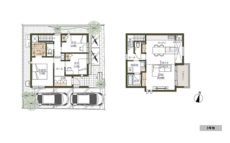| 間取り | 3LDK(2戸) | 建物構造 | 軽量鉄骨2階建(1戸)、木造2階建(軸組工法)(1戸) |