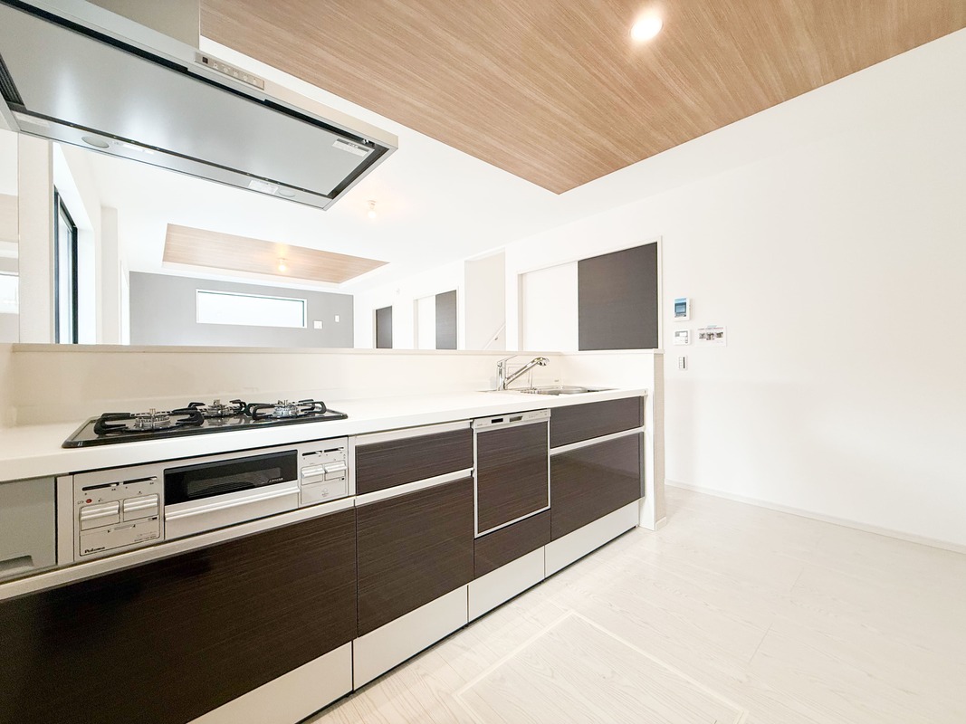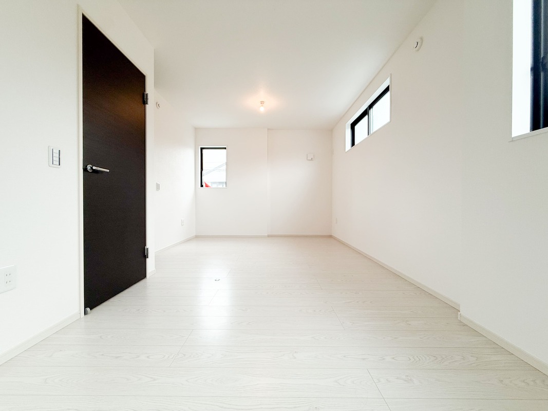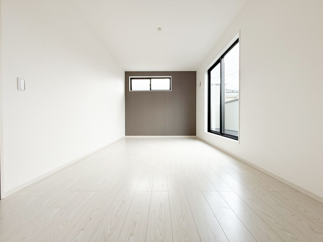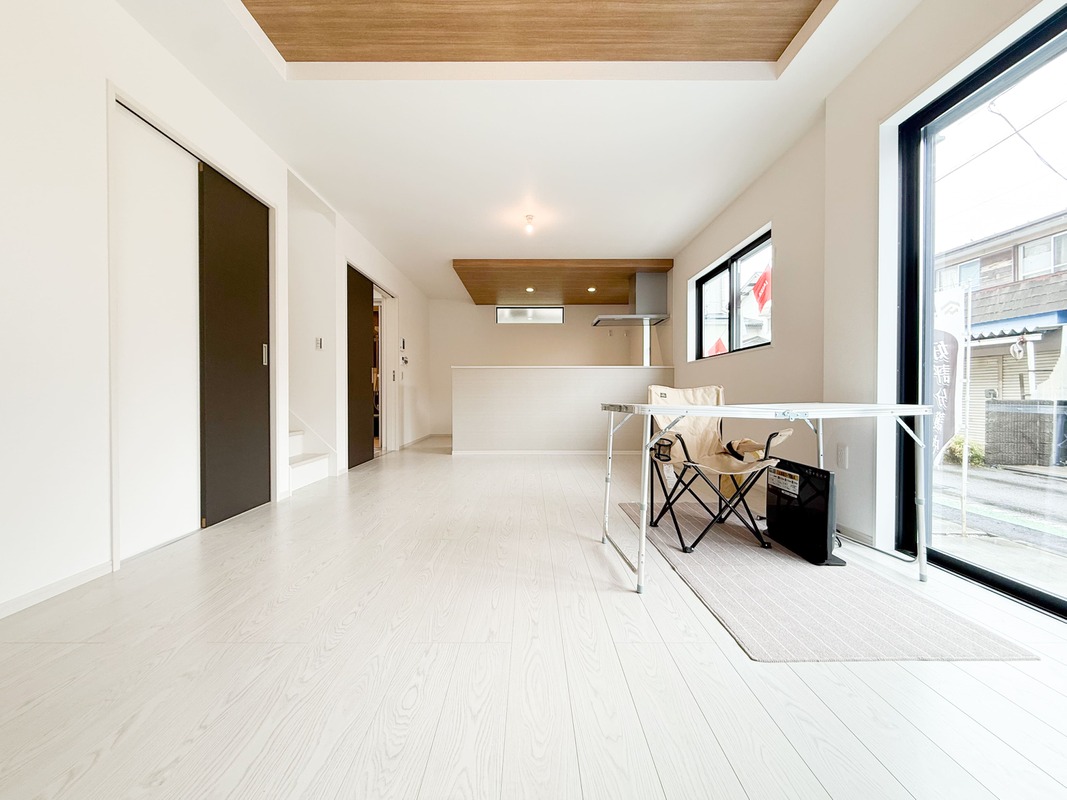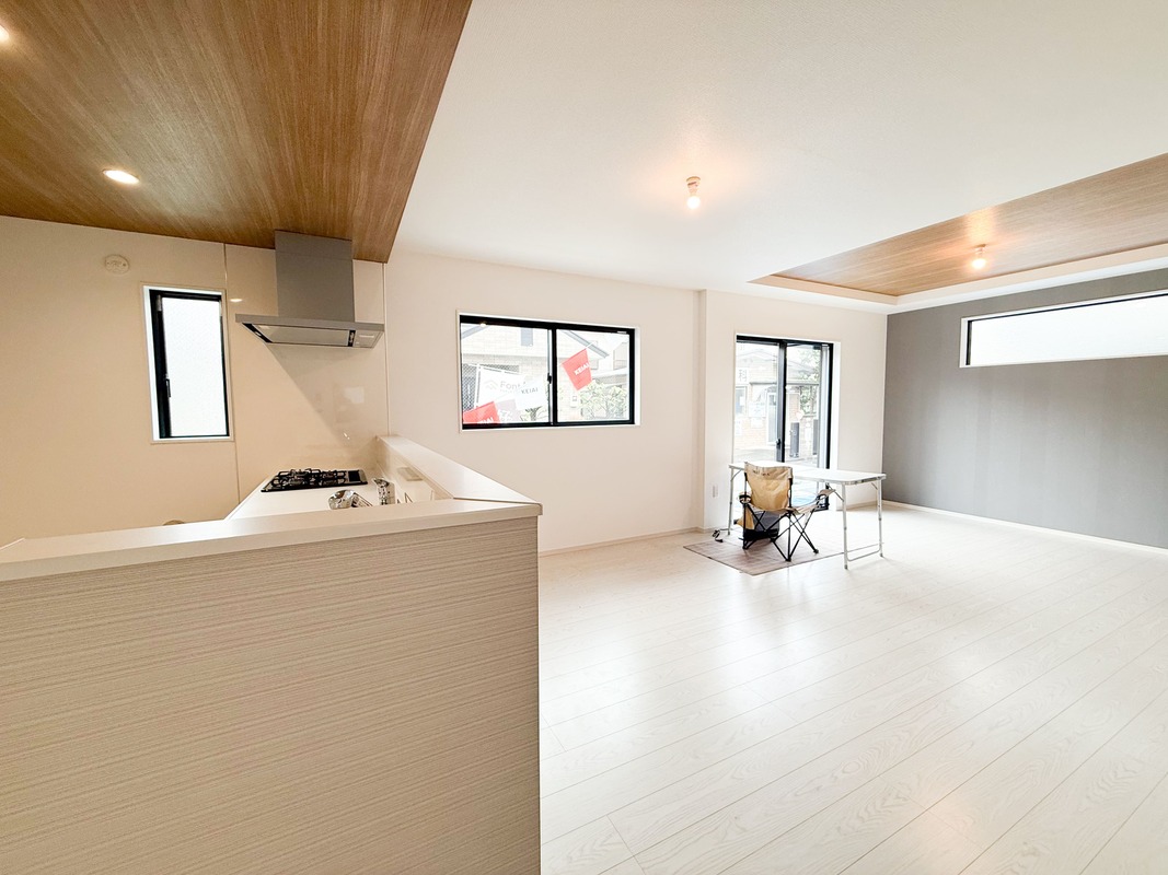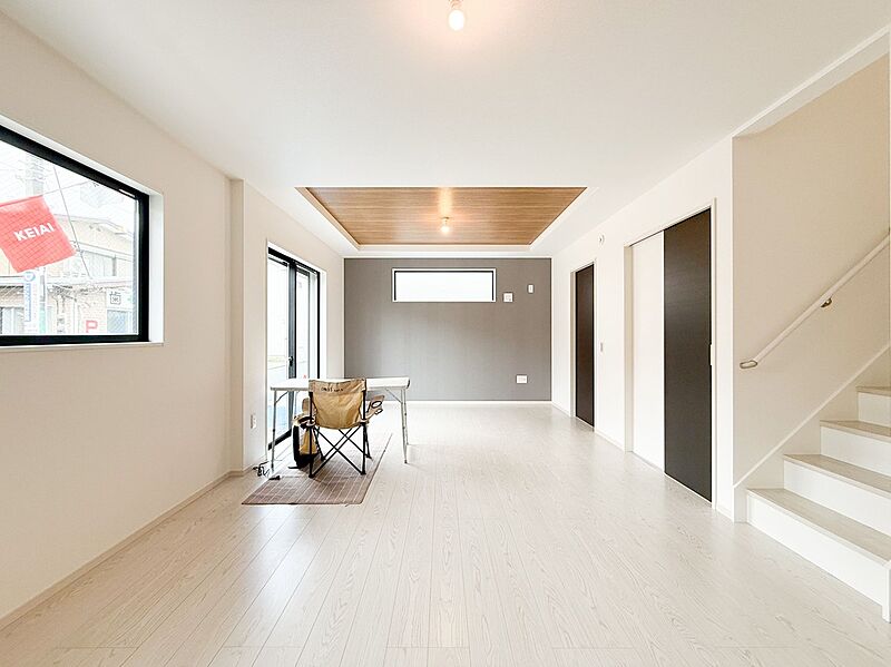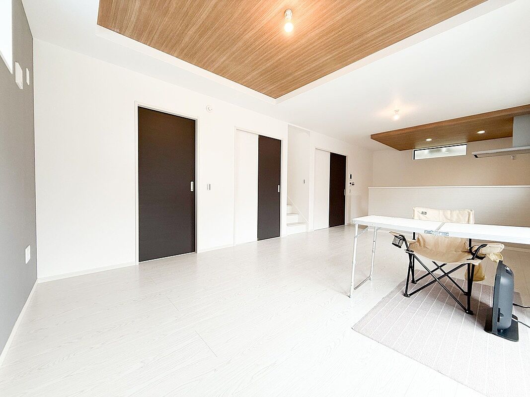 魅力1)広々な室内設計。リビングは折り上げ天井による開放感をあじわえます。2階居室には将来2室に分けることができる2in1ルーム採用。