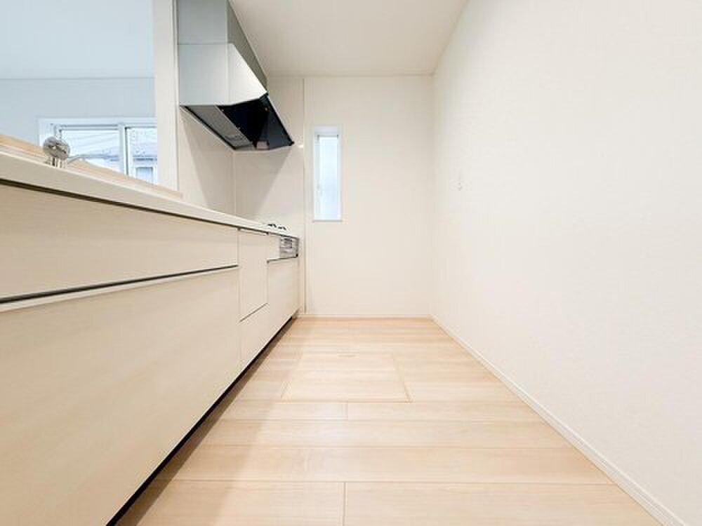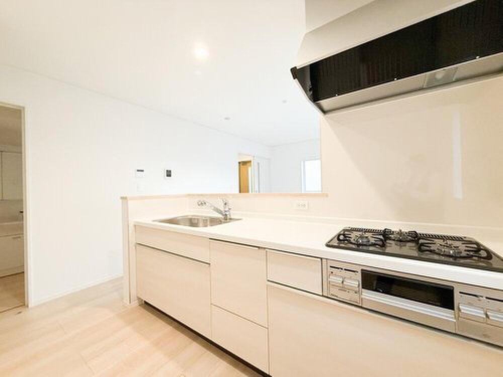 リビングやダイニングとつながる対面式のシステムキッチン。広々とした調理スペースに加え、収納力も豊富で機能性が高く、使い勝手良好。料理をしながら家族やゲストと自然に会話が楽しめる設計です。