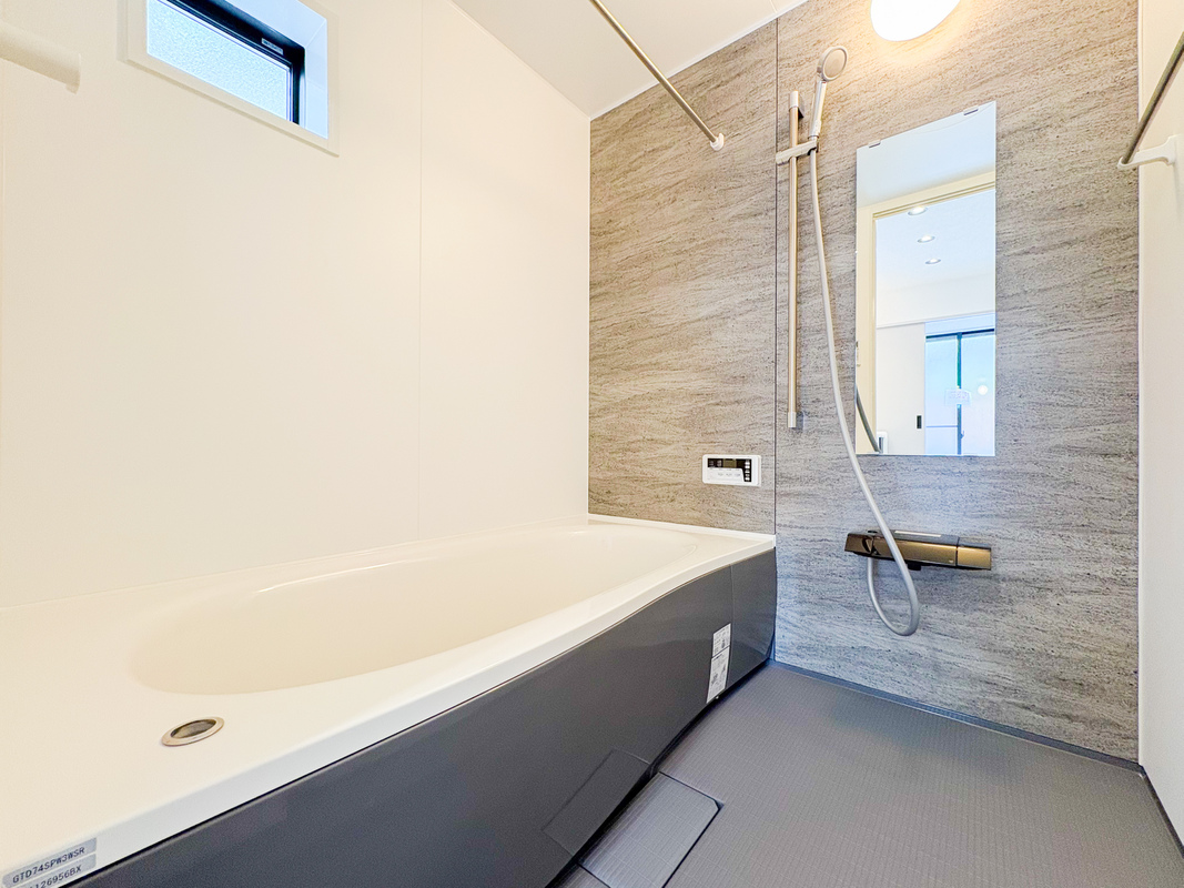 浴室乾燥機能付きのバスルームは、雨の日の...