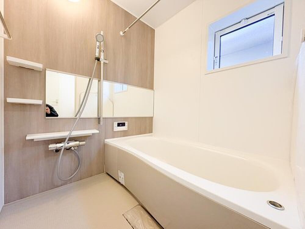 落ち着いた色調のアクセントパネルが施されています。足を伸ばせる浴槽で、ゆっくりと1日の疲れを癒すことができそうです。