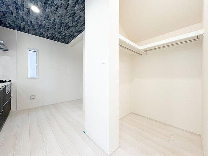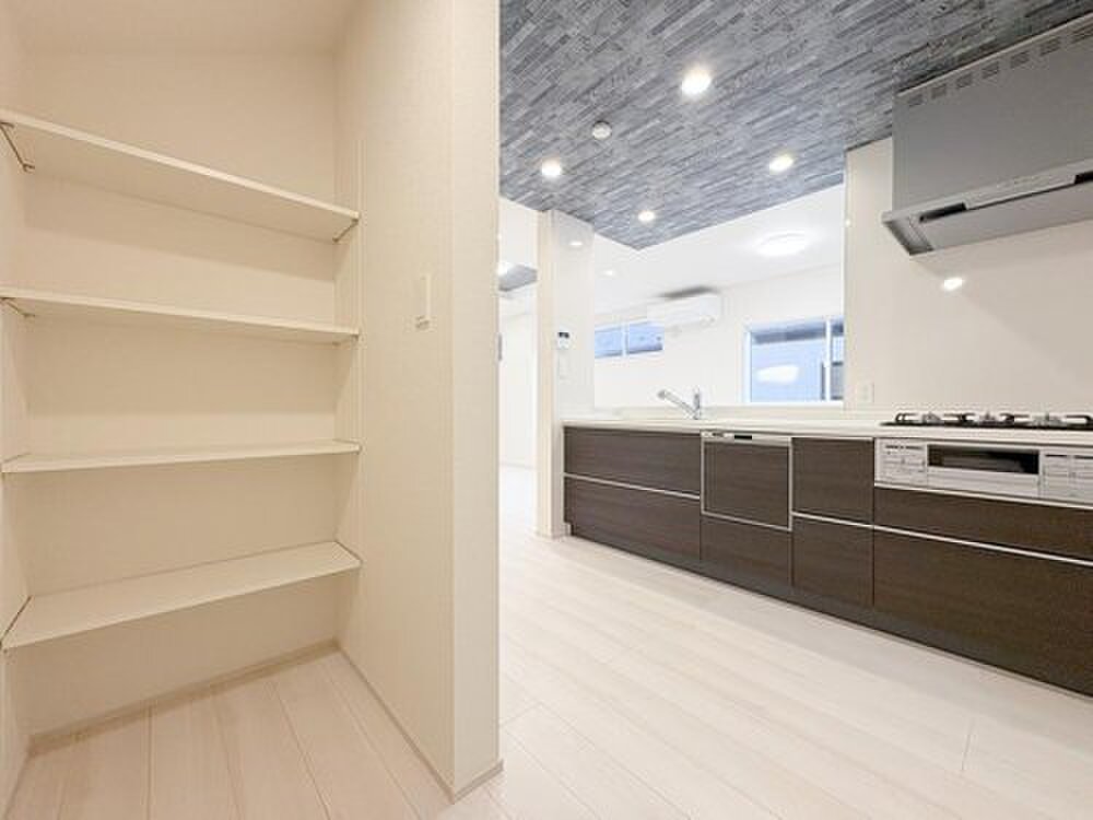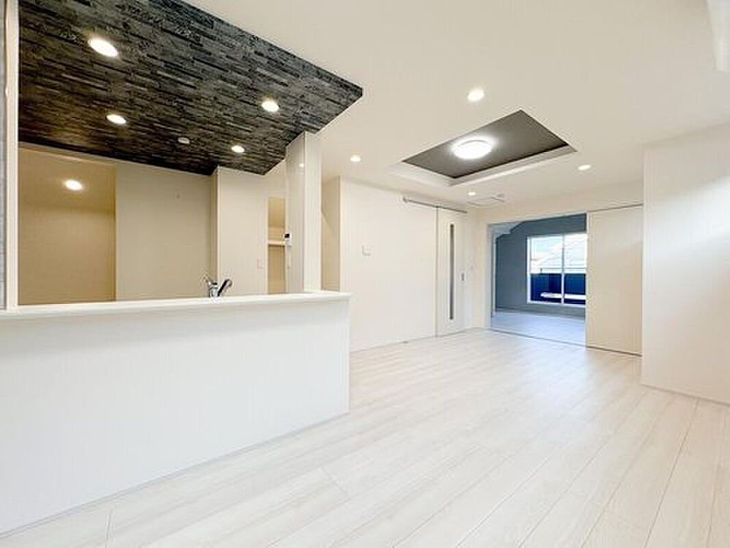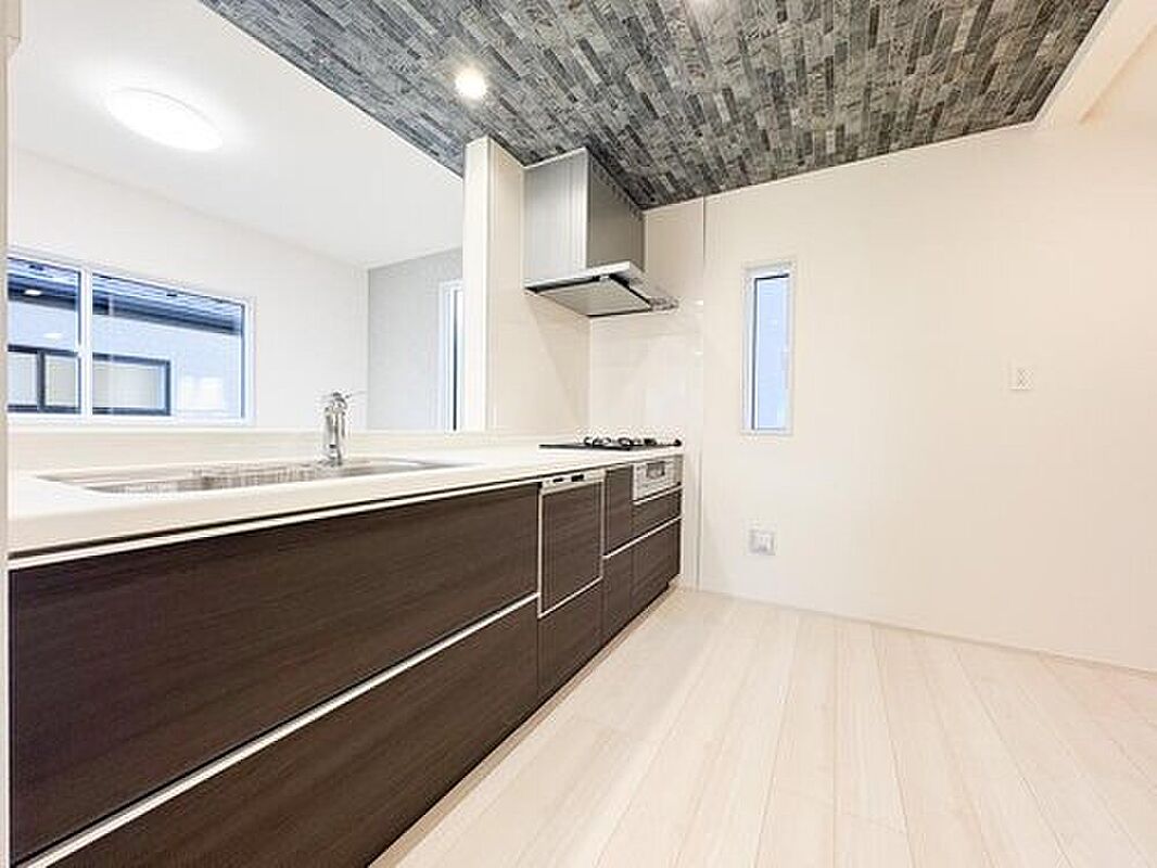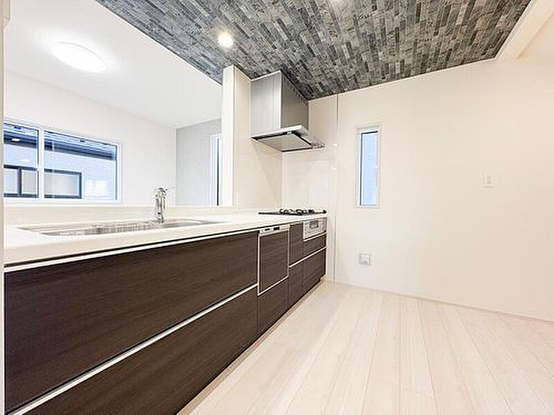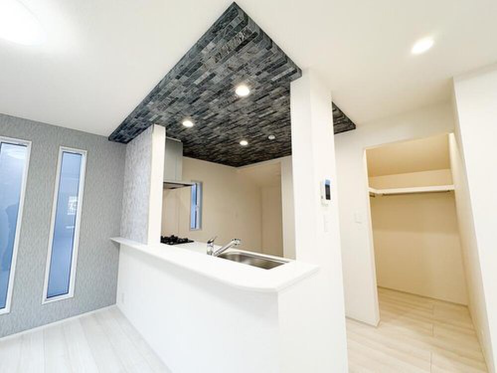 キッチンにはお利下げ天井が採用されており、おしゃれな空間が際立ちます。