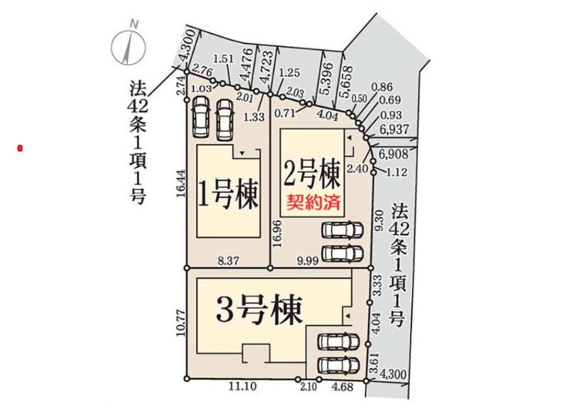 | 建物面積 | 1号棟108.89m2(32.93坪)3号棟104.34m2(31.56坪) | 土地面積 | 1号地150.37m2(45.48坪)3号地196.77m2(59.52坪) |