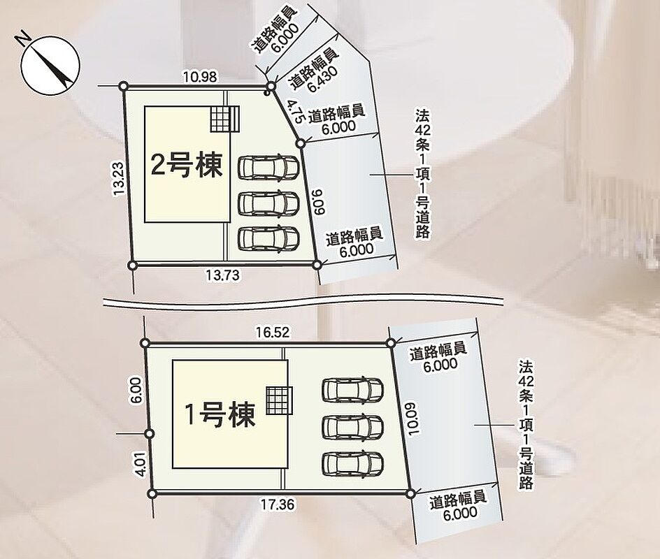 | 建物面積 | 1号棟107.73m2(32.58坪)2号棟105.29m2(31.85坪) | 土地面積 | 1号棟169.47m2(51.26坪)2号棟170.84m2(51.67坪) |
