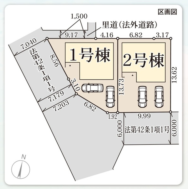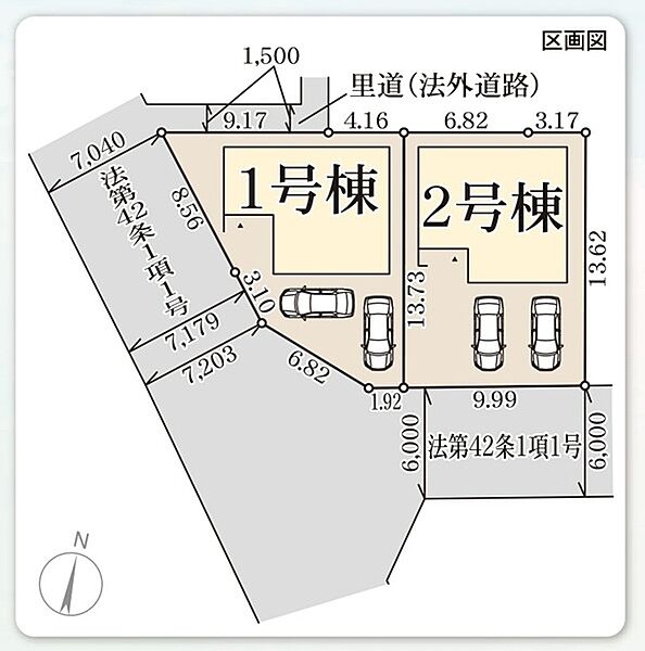 | 駐車場 | 2台 | 道路の幅員 | 南東側6m公道、南西側7.2m公道、北側1.5m認定外道路 |