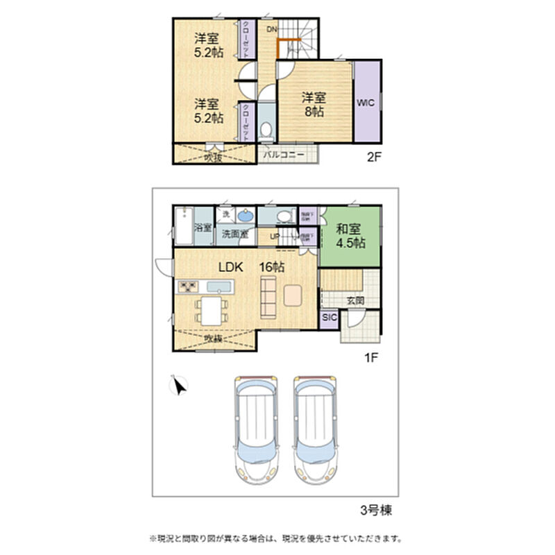 | 建物面積 | 3号棟97.71m2(29.55坪)2号棟93.56m2(28.3坪) | 土地面積 | 165.38m2(50.02坪) |