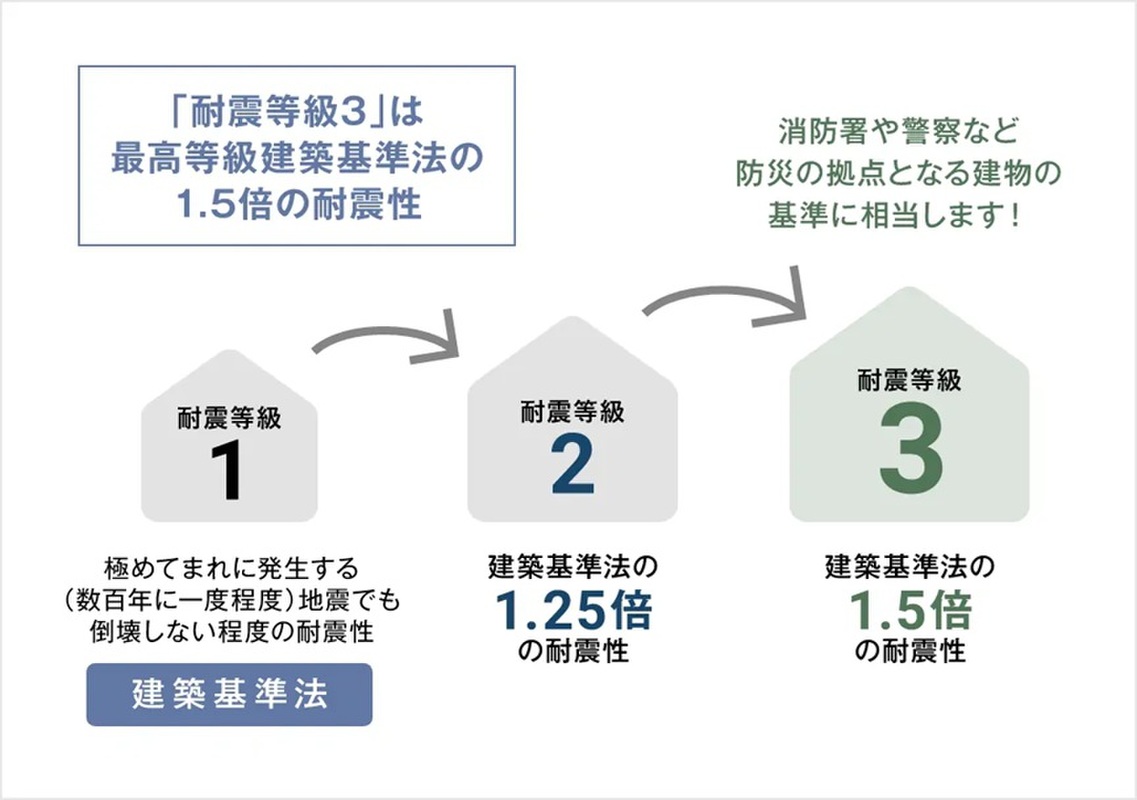 全物件、最高等級である耐震等級3級を取得。建築基準法で定める地震力の1.5倍の力に対して耐えられる程度の耐震性があります。