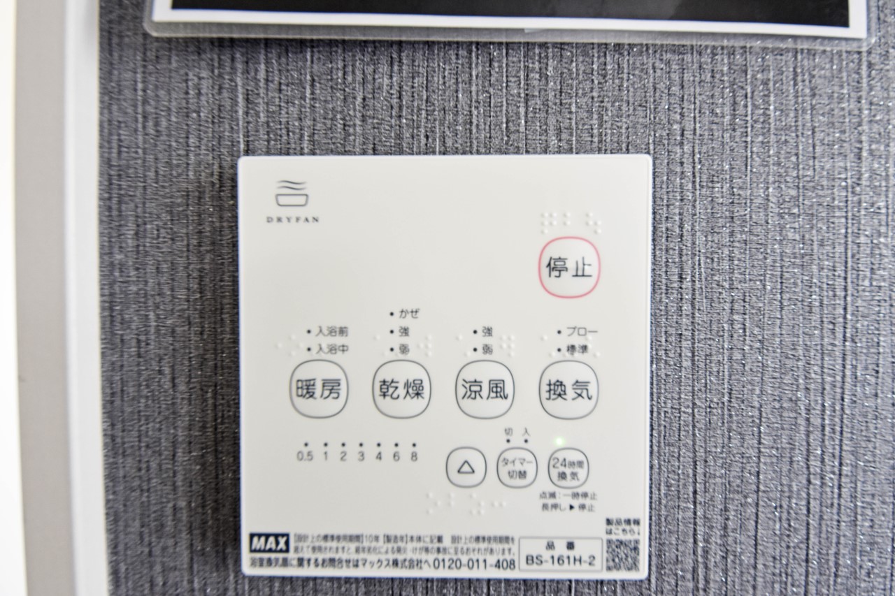 浴室暖房換気乾燥機:換気機能によってバスルーム内のカビの発生を抑制できるのに加え、夜間や雨の日の洗濯物の乾燥に便利な乾燥機能も装備。さらに、暖房機能も備えているので、冬の寒い時期には入浴前に予備暖房をすることも可能♪