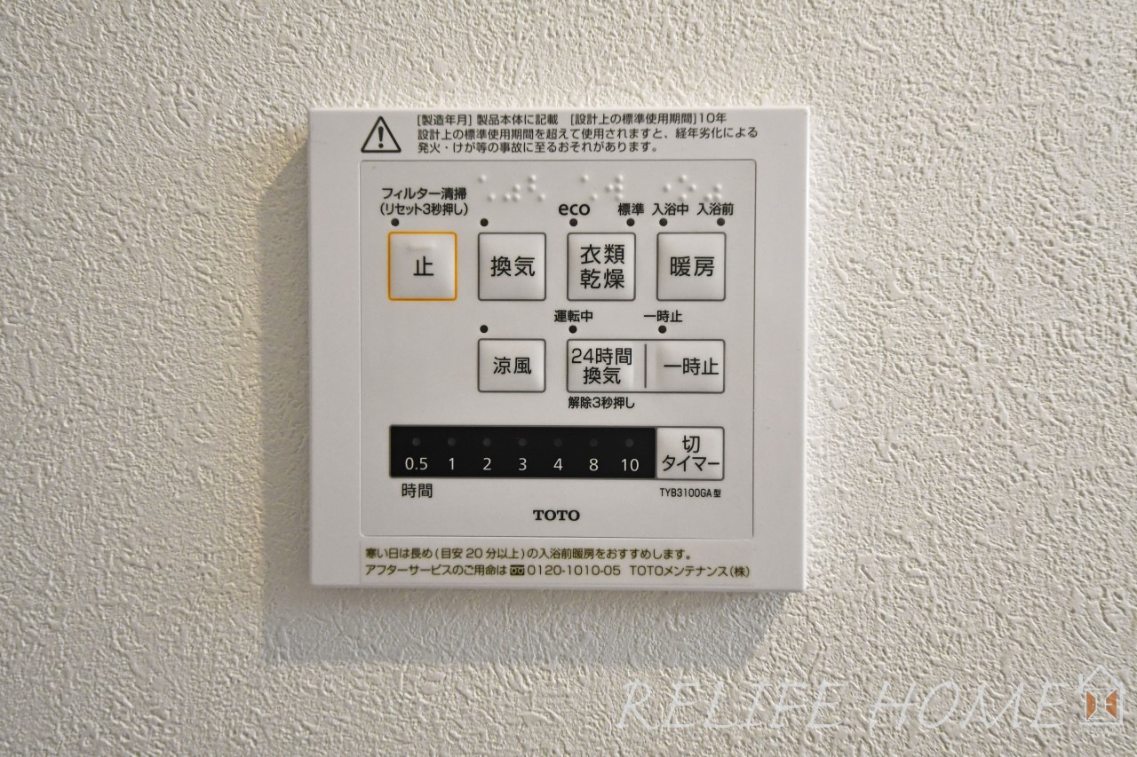 浴室暖房換気乾燥機:換気機能によってバスルーム内のカビの発生を抑制できるのに加え、夜間や雨の日の洗濯物の乾燥に便利な乾燥機能も装備。さらに、暖房機能も備えているので、冬の寒い時期には入浴前に予備暖房をすることも可能♪