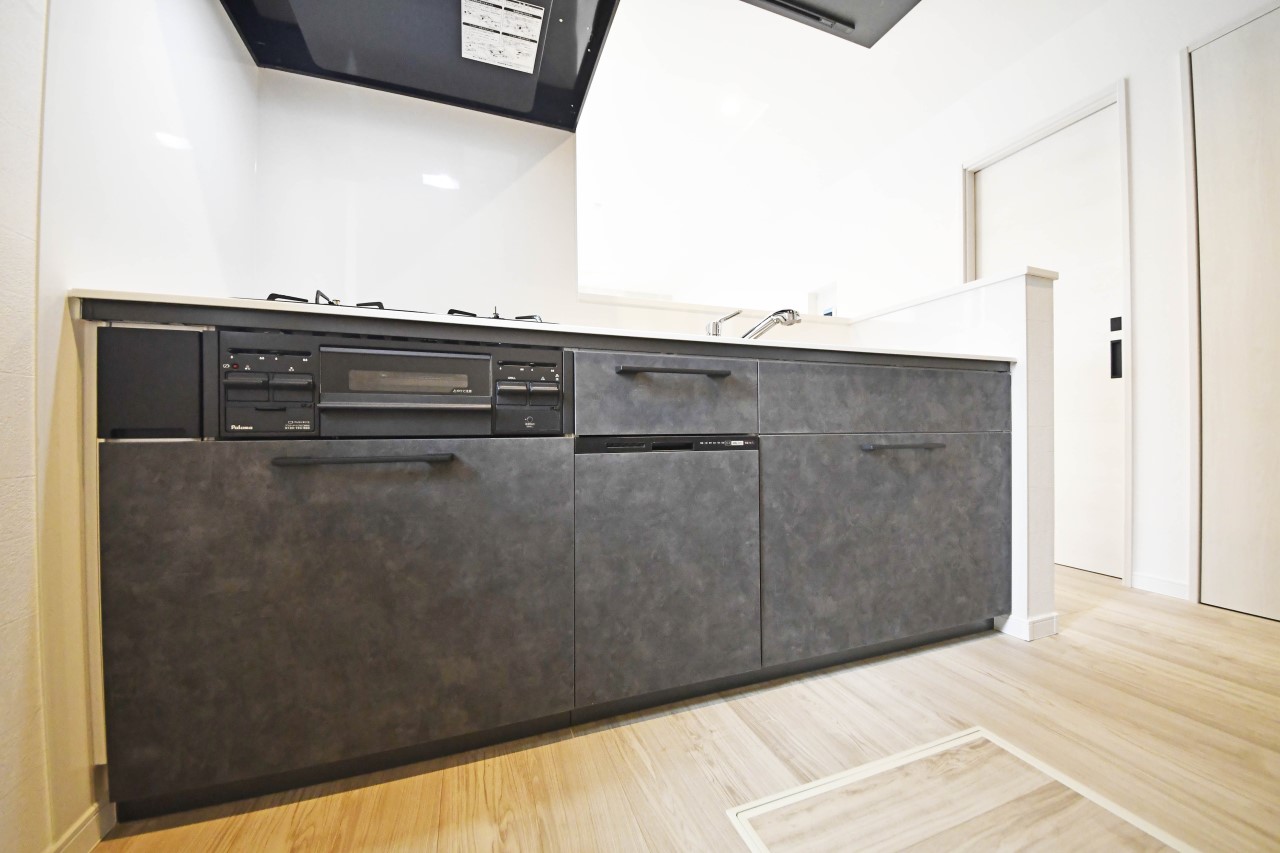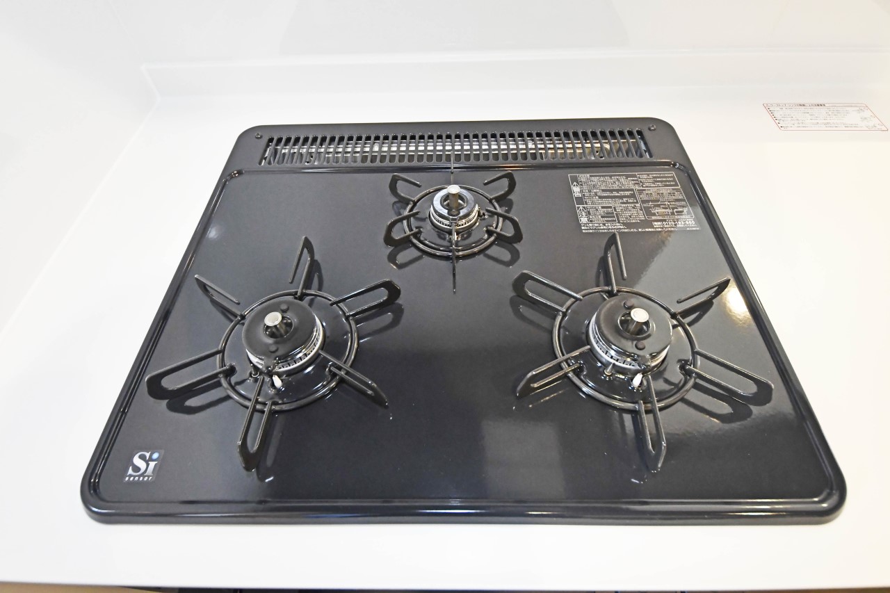 システムキッチン:料理の幅を拡げてくれる三口コンロ。ワイドなカウンターで、将来お子様と一緒にお料理をするときも重宝します♪