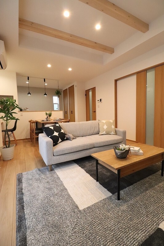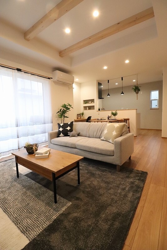 意匠性の高い梁出し天井が、空間に奥行きと温かみをプラス 。家族...