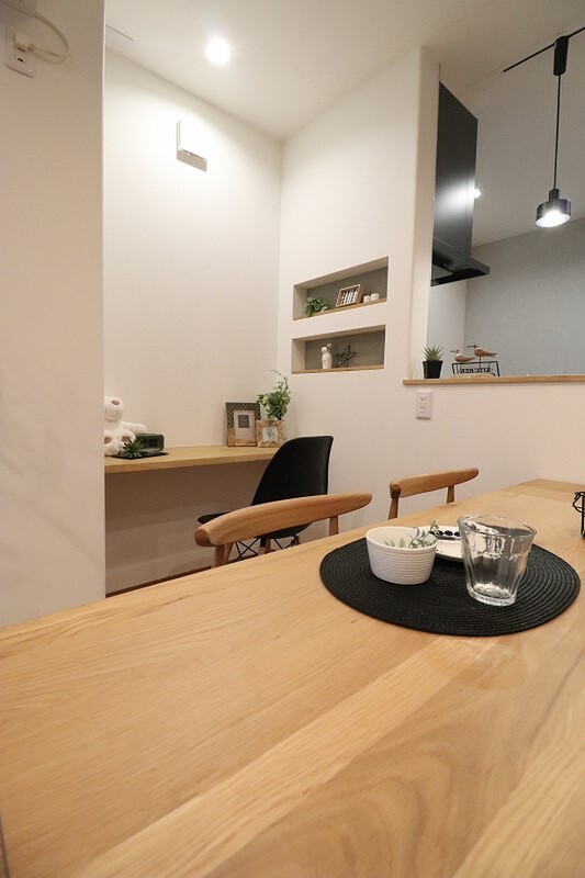 ダイニング横に便利なカウンターを設置。小物を飾れるニッチも備え...