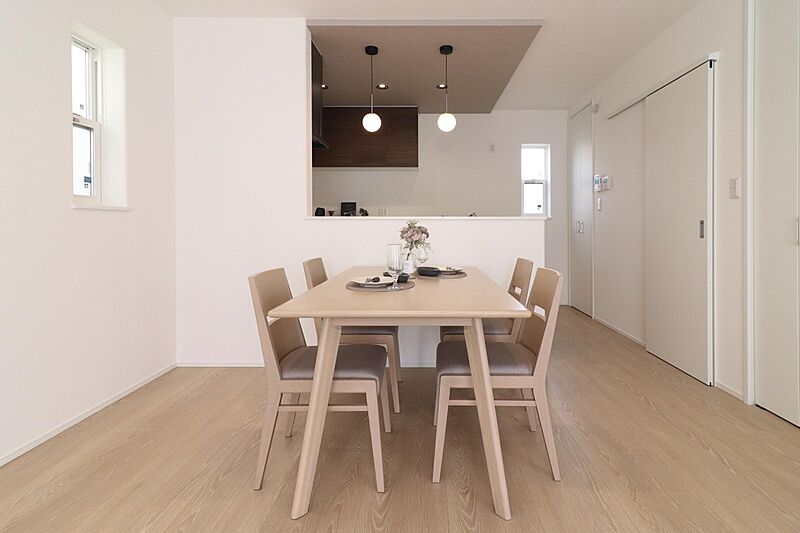 大きな窓から光が差し込むリビングは、家族が自然と集まる心地よい空間。ダイニングや畳コーナーとつながることで、子どもが遊んでいる姿を見守りながら、家事を進めることもできます。休日は家族で映画を見たり、友人を招いて食事を楽しんだり。日常の暮らしから特別な時間まで、家族の笑顔があふれる中心となる場所です。