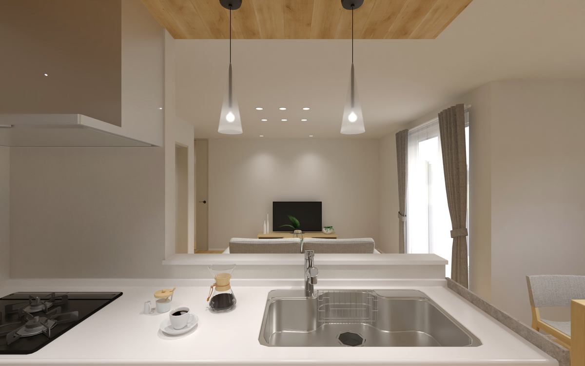 リビング・ダイニングを見渡せる対面キッチン。下がり天井が空間の...