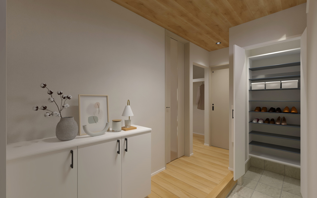 玄関まわりに収納をしっかり確保し、靴や小物もすっきり。来客時も...