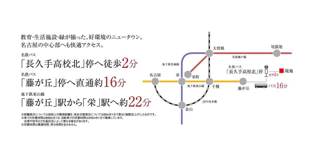 名古屋市営東山線「藤が丘」駅 名鉄バス16分「長久手高校北」停 徒歩2分~3分 名鉄バス「長久手高校北」停 徒歩2分~3分 愛知高速東部丘陵線「はなみずき通」駅 徒歩24分 |