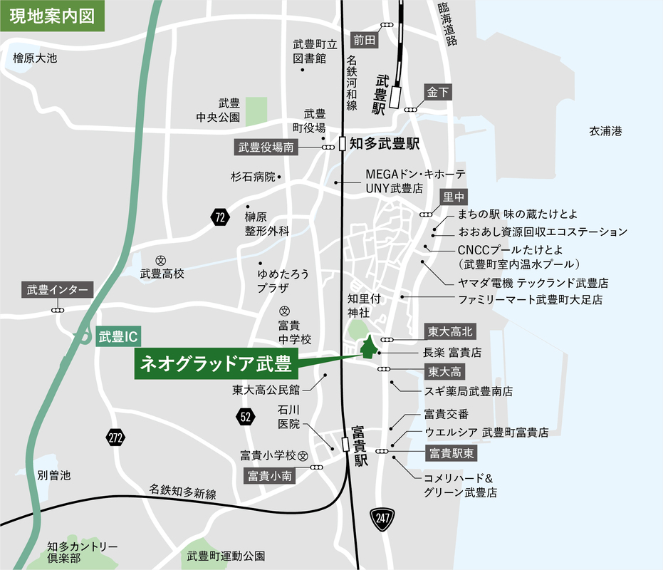 鎮守の森のちかく、緑豊かな立地。温水プールや音楽ホールなど文化設備が充実した武豊町。のびやかで静かな住環境が魅力です。