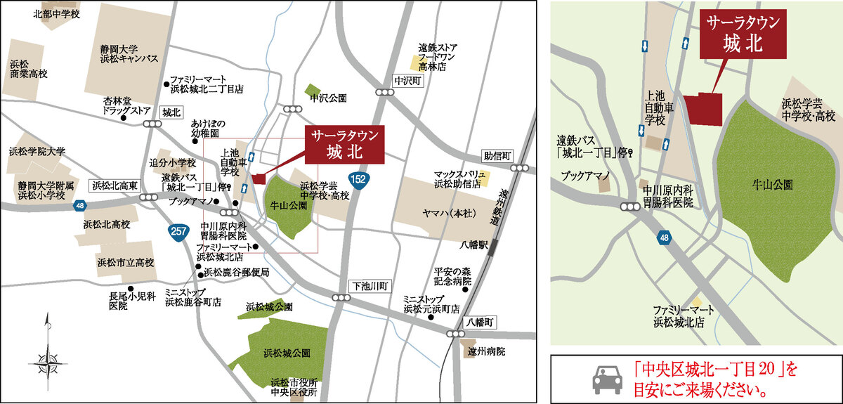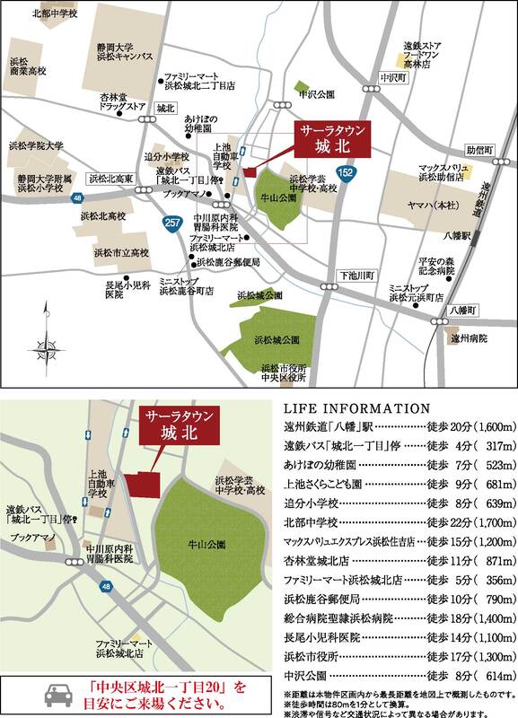 遠州鉄道「八幡」駅 徒歩20分 遠鉄バス「城北一丁目」停 徒歩4分 |