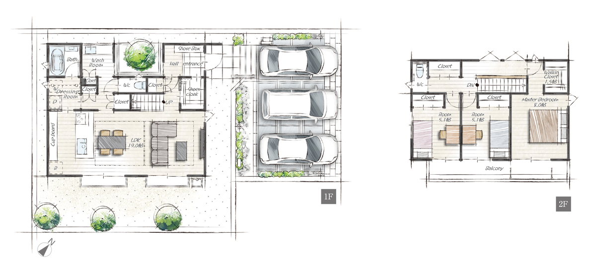| 建物面積 | 105.18m2・107.66m2(31.81坪・32.56坪) | 土地面積 | 174.2m2・185.8m2(52.69坪・56.20坪) |