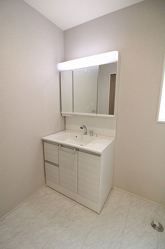 清潔感のある白を基調とした洗面台。三面鏡裏収納には化粧品や洗面...