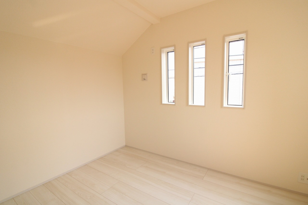 屋根形状に合わせて天井を高く設計しているため、開放感のある洋室...