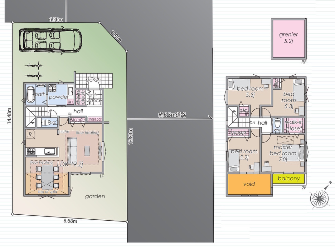 | 駐車場 | 1台 | 道路の幅員 | 北東側約6.5m、北西側約6.4m |