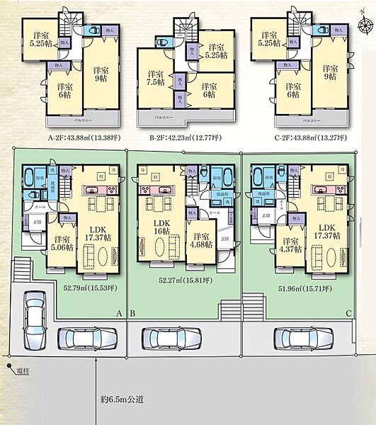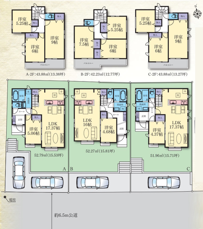| 建物面積 | 94.50m2・95.84m2・96.67m2 | 土地面積 | 133.01m2・133.88m2・134.36m2 |