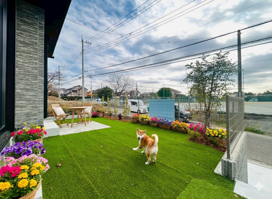【3】】玄関横の庭スペースは、ペットの外気浴や遊び場に最適。散歩の前後も動線が短く、足拭き・お手入れがスムーズ。毎日使う場所だからこそ、暮らしの快適さが変わります。