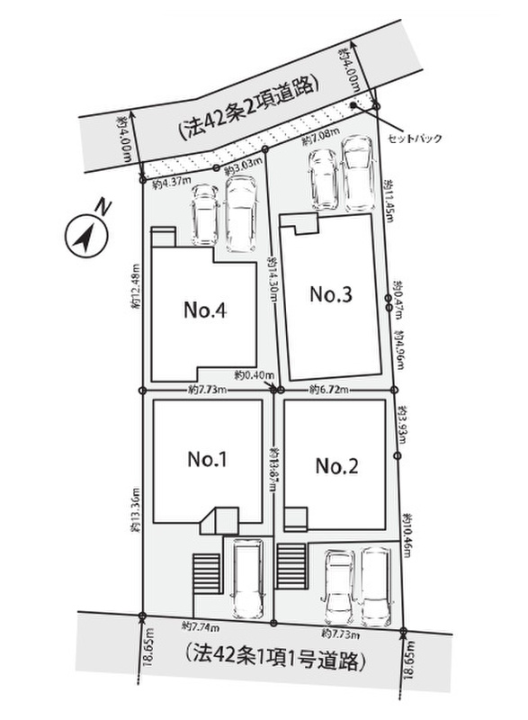 | 駐車場 | 1台 ~ 2台(1号棟1台・2号棟~4号棟2台) | 道路の幅員 | 北西側公道幅員約4.0mに約14.4m接する。南側公道幅員約18.6mに約15.4m接する。 |